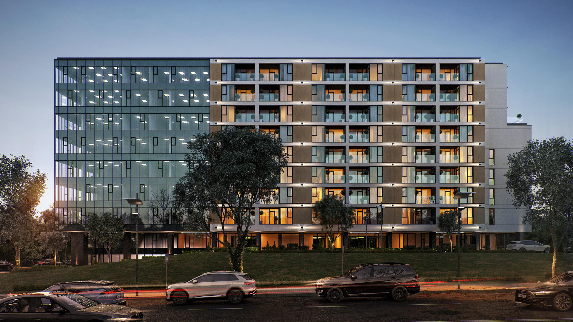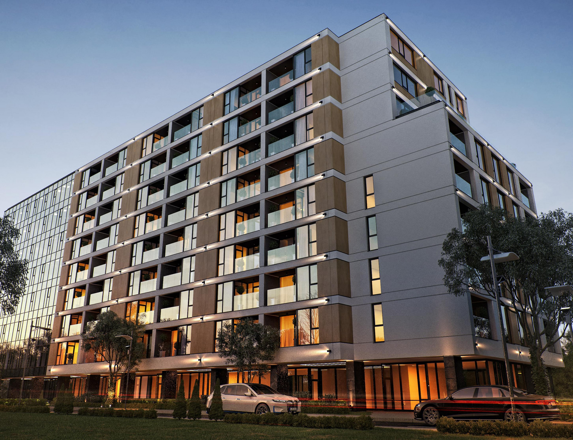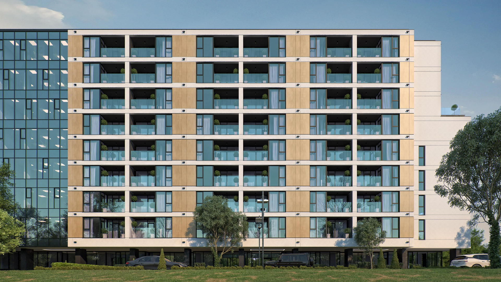 Високотехнологична, дишаща фасада, представляваща комбинация от топлоизолационна система на Baumit с минерална мазилка по архитектурен детайл от експандиран полистирол EPS 10 см и вентилируема, окачена върху алуминиева конструкция, облицована с керамични плочи на водещия италиански производител Laminam, от колекцията Seta, със златист мотив. Плочите Laminam запазват своите спецификации, дори когато са изложени на топлина, UV лъчи и замръзване. Също така са устойчиви на удари, петна и драскотини. В окачения фасаден пакет ще бъде вградена изолация от 10 см каширана каменно-минерална вата, марка ROCKWOOL с пародифузна и ветрозащитна мембрана, която има плътност 50 кг/м³, минимални топлозагуби - λ = 0,035 W/mK. Вентилируемата фасада осигурява отлична топлоизолация и паропропускливост, задържа влагата извън сградата, намалява топлинните загуби през зимата и проникването на горещ въздух през лятото, повишава хидроизолацията и шумоизолацията, защитата срещу сняг, дъжд и конденз откъм вътрешните страни на стените на сградата.