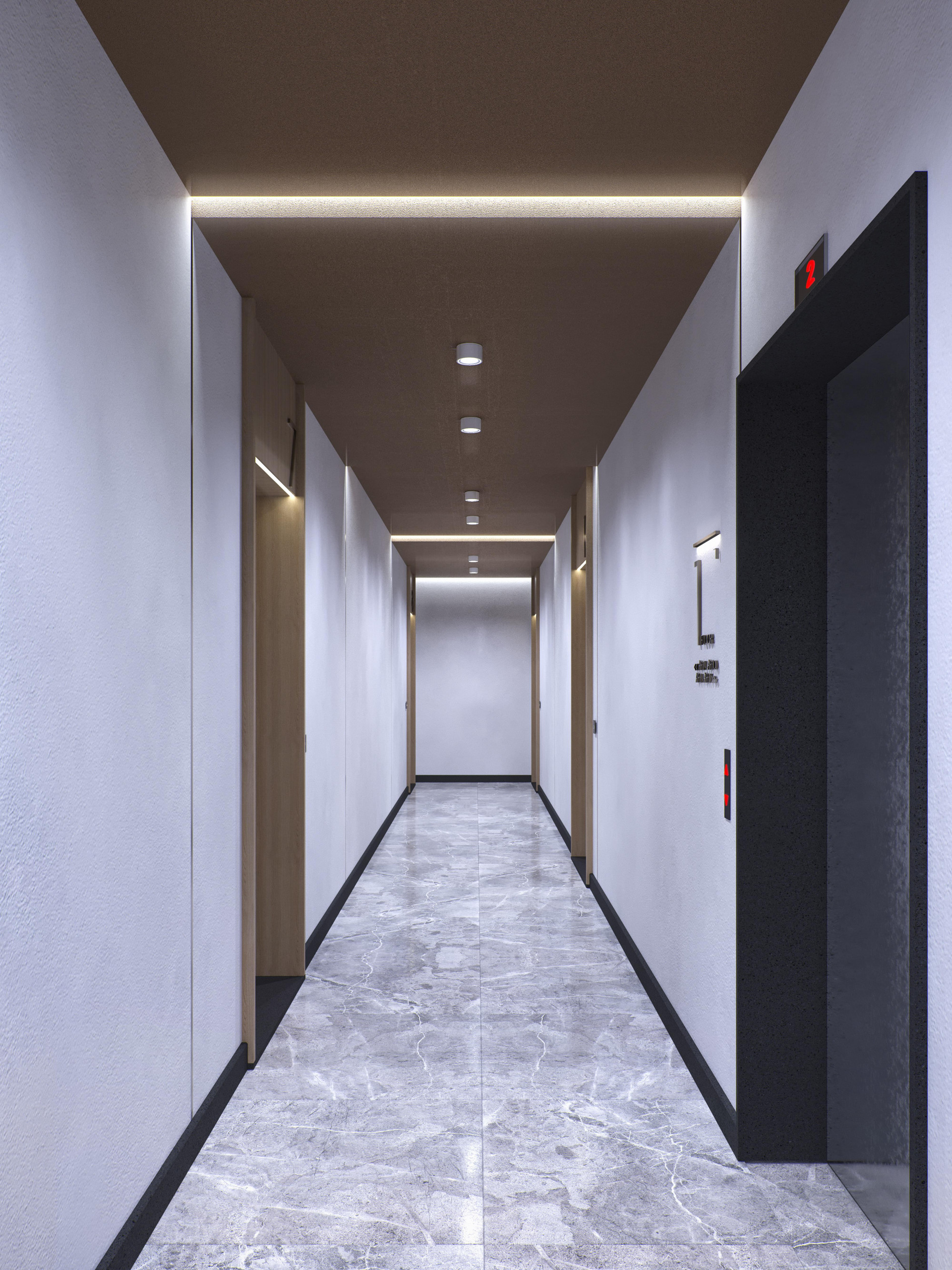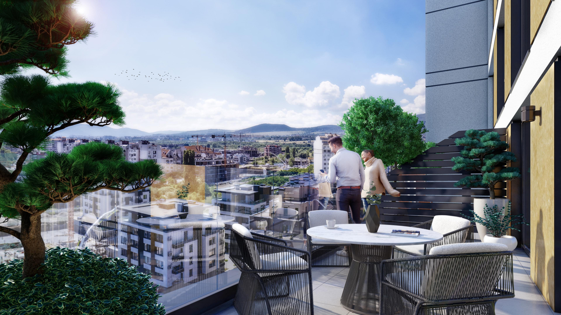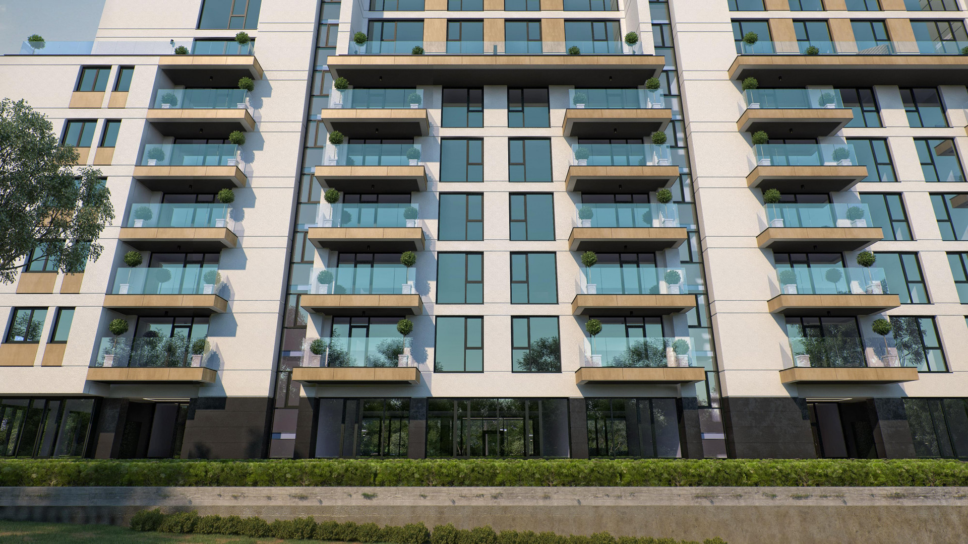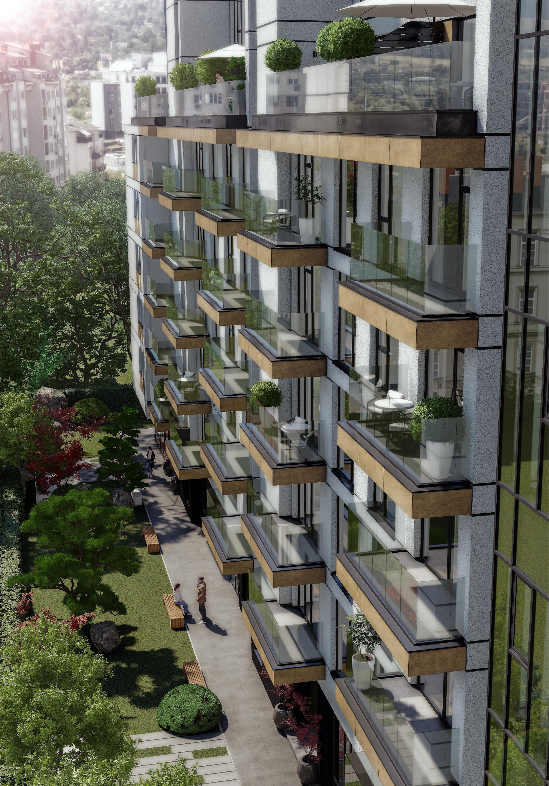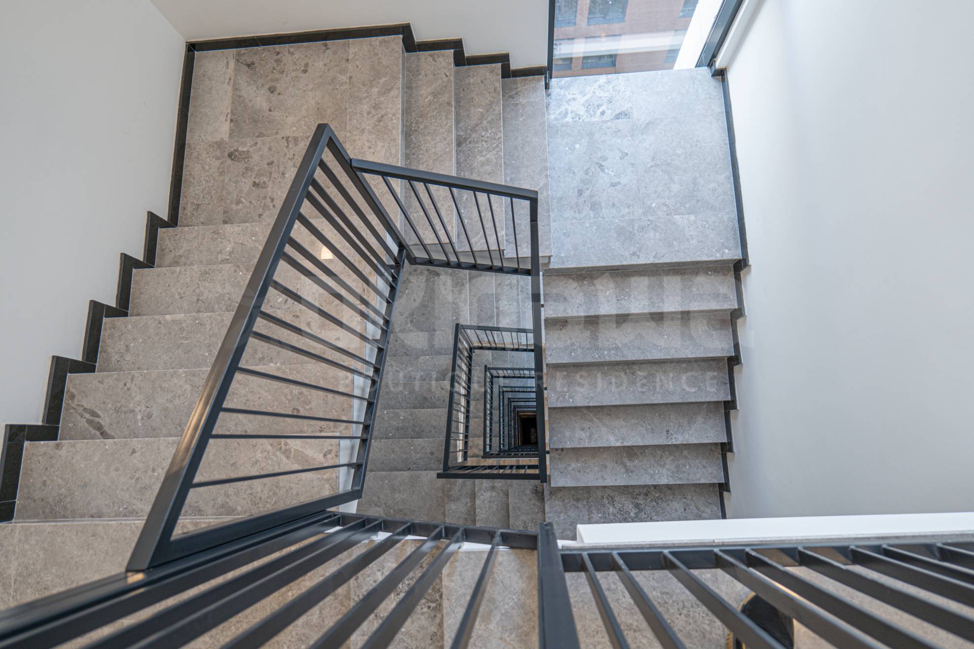 Настилките по общите части на сградата, фоайе, коридори и стълбища ще са изпълнени с плочи от естествен камък — полиран гранит. Стълбищните парапети са ажурни, от алуминий, по архитектурен детайл, видим в интериорните 3D визуализации на сградата. Ще бъдат предвидени стъклени врати към етажните площадки, които са димоуплътнени и самозатварящи се. За настилките на балконите и лоджиите сме избрали италиански гранитогрес, осигурен срещу хлъзгане. Откритите тераси ще са с изграден двоен под и подови настилки от италиански керамични плочи.
