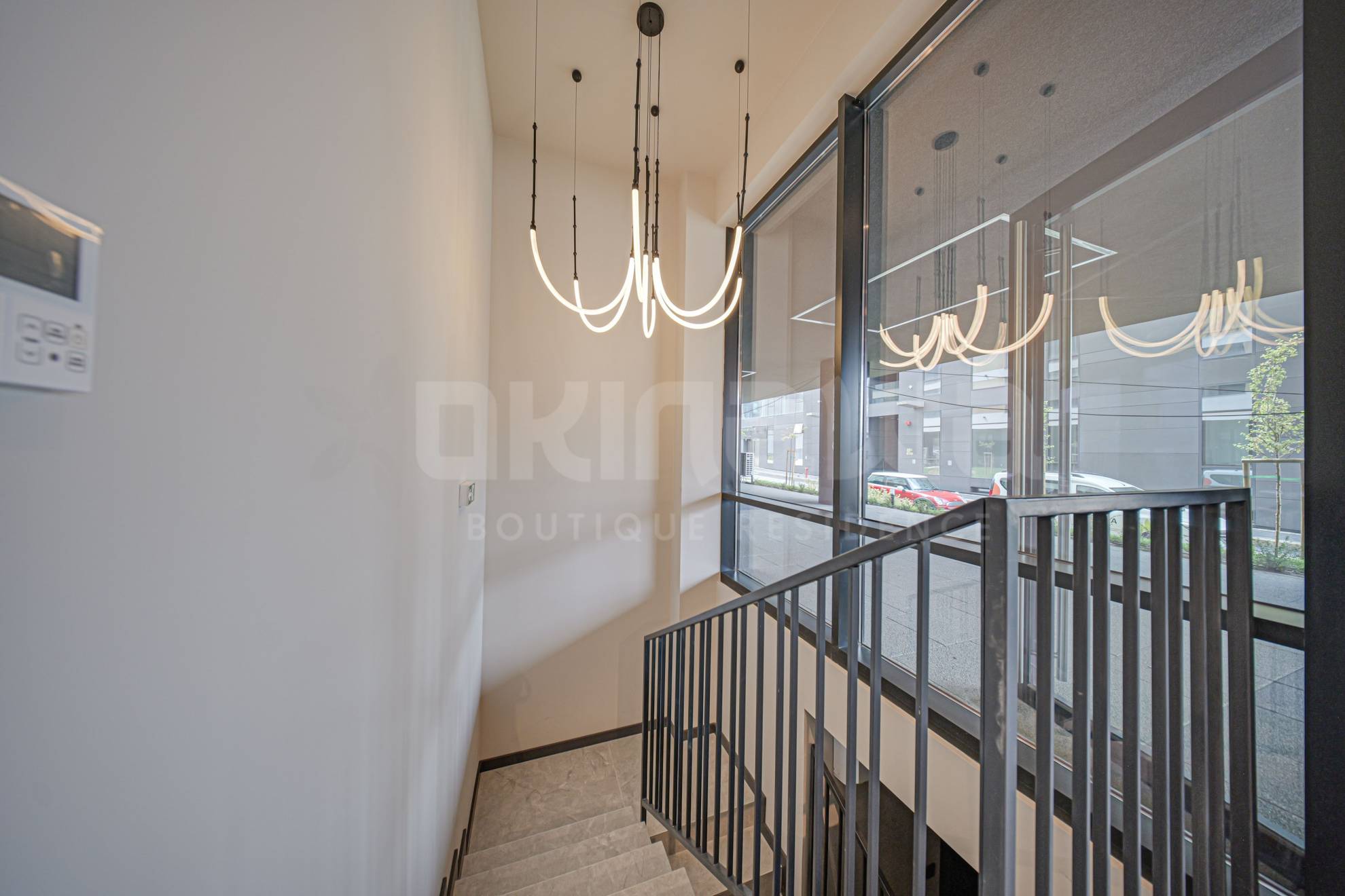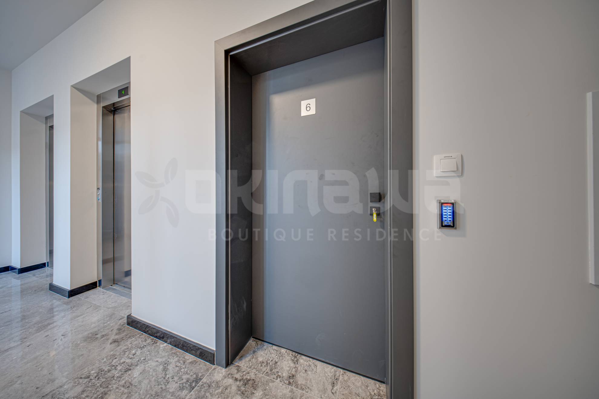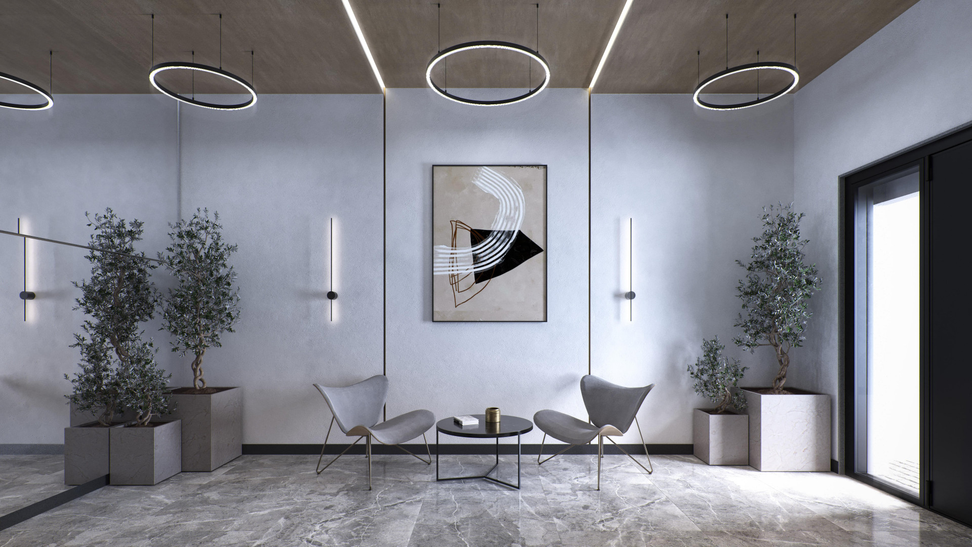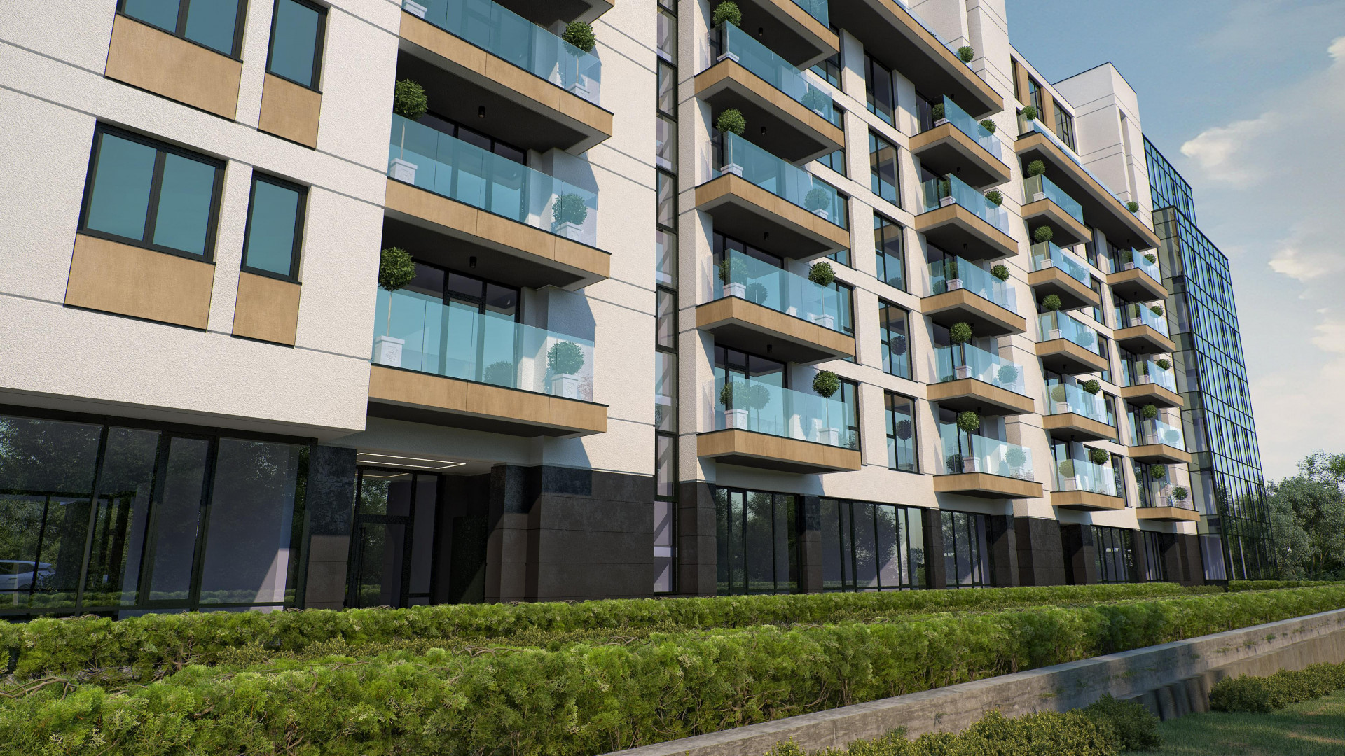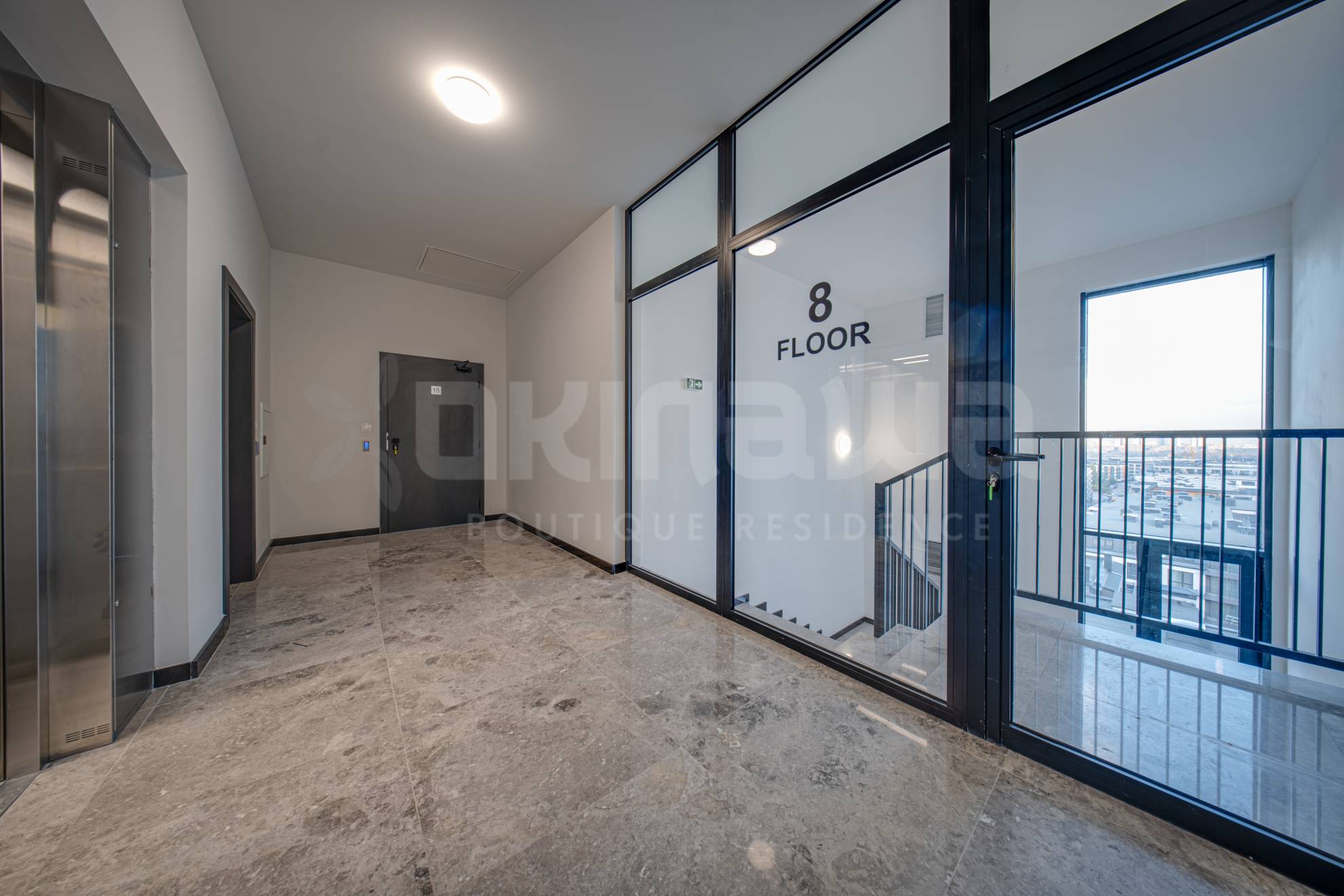 Настилките по общите части на сградата, фоайе, коридори и стълбища ще са изпълнени с плочи от естествен камък — полиран гранит. Стълбищните парапети са ажурни, от алуминий, по архитектурен детайл, видим в интериорните 3D визуализации на сградата. Ще бъдат предвидени стъклени врати към етажните площадки, които са димоуплътнени и самозатварящи се. За настилките на балконите и лоджиите сме избрали италиански гранитогрес, осигурен срещу хлъзгане. Откритите тераси ще са с изграден двоен под и подови настилки от италиански керамични плочи.
