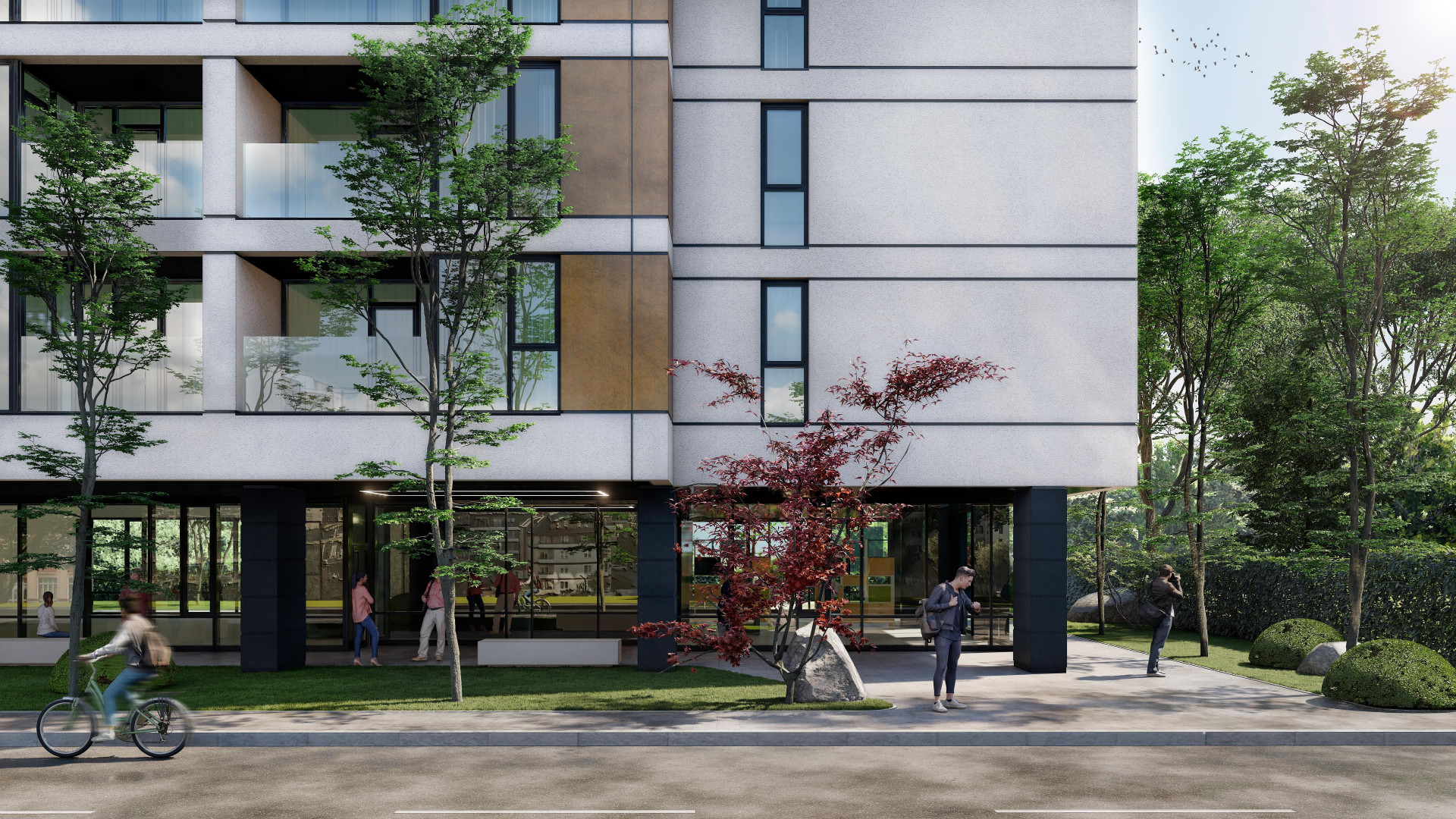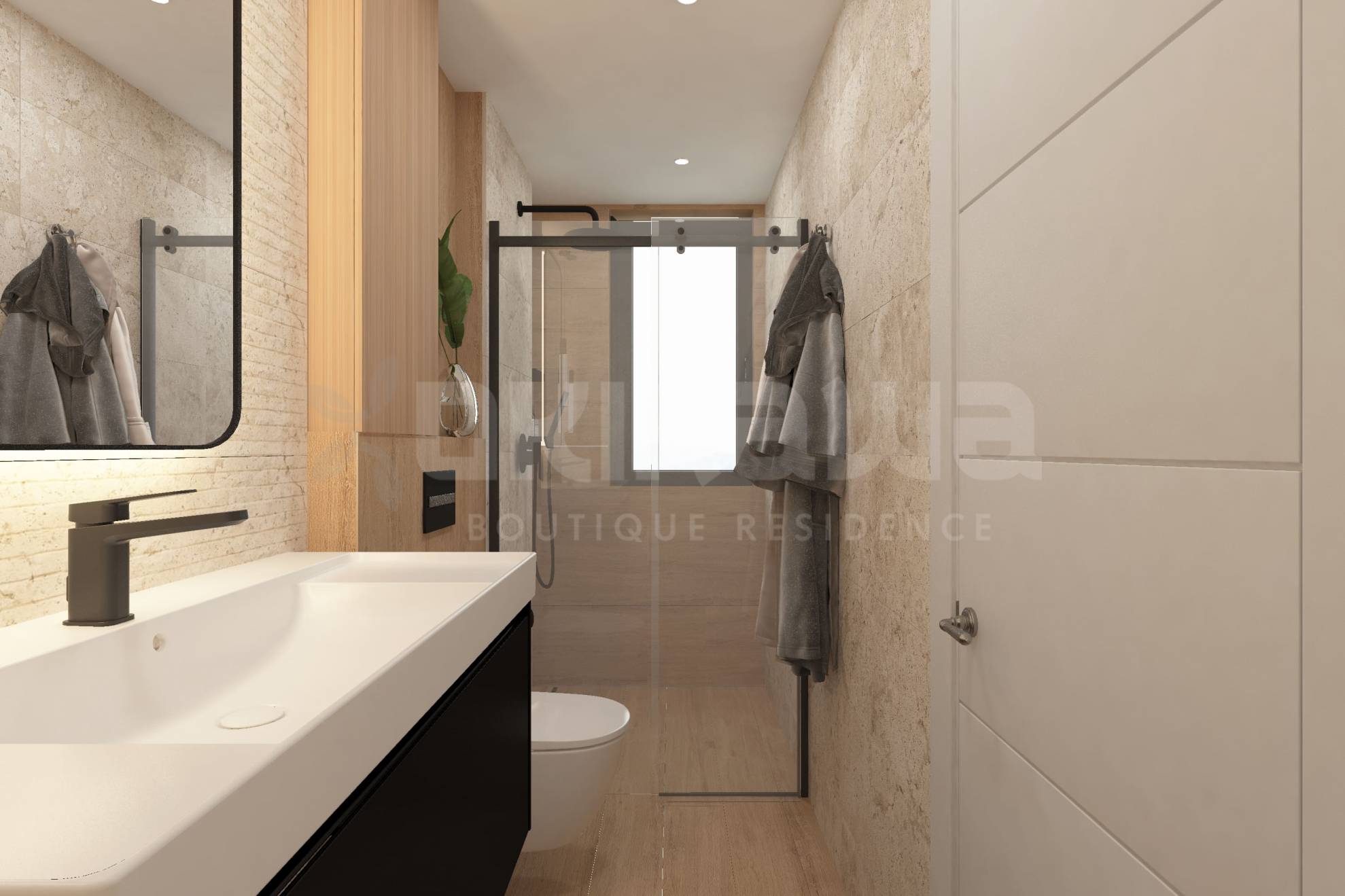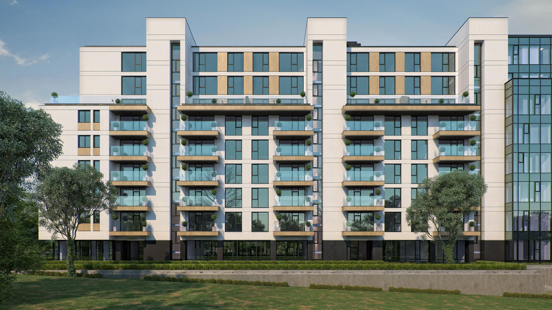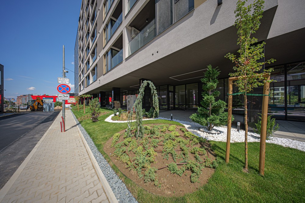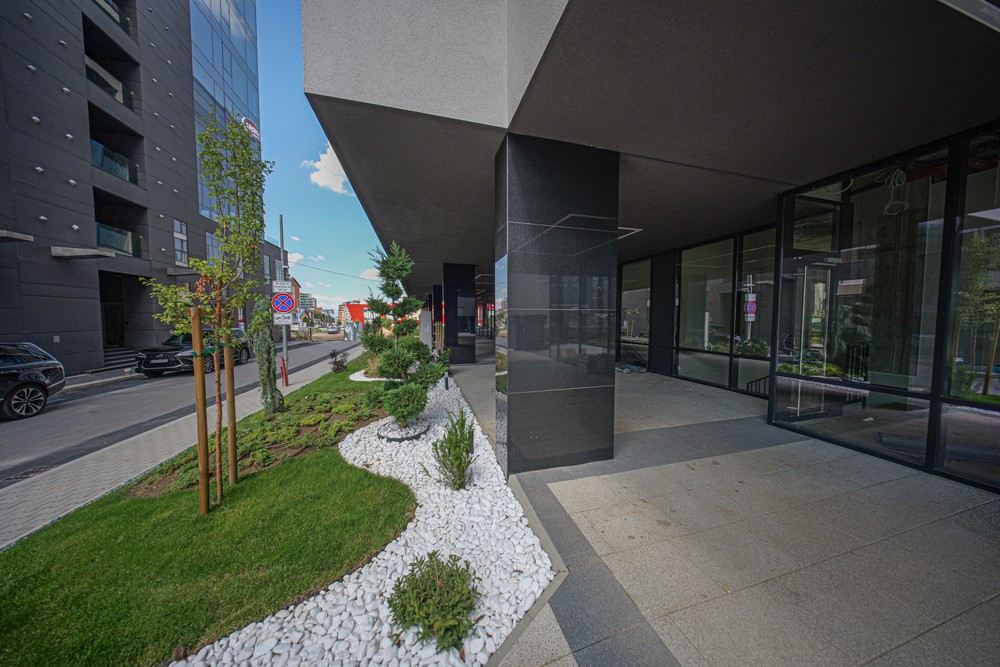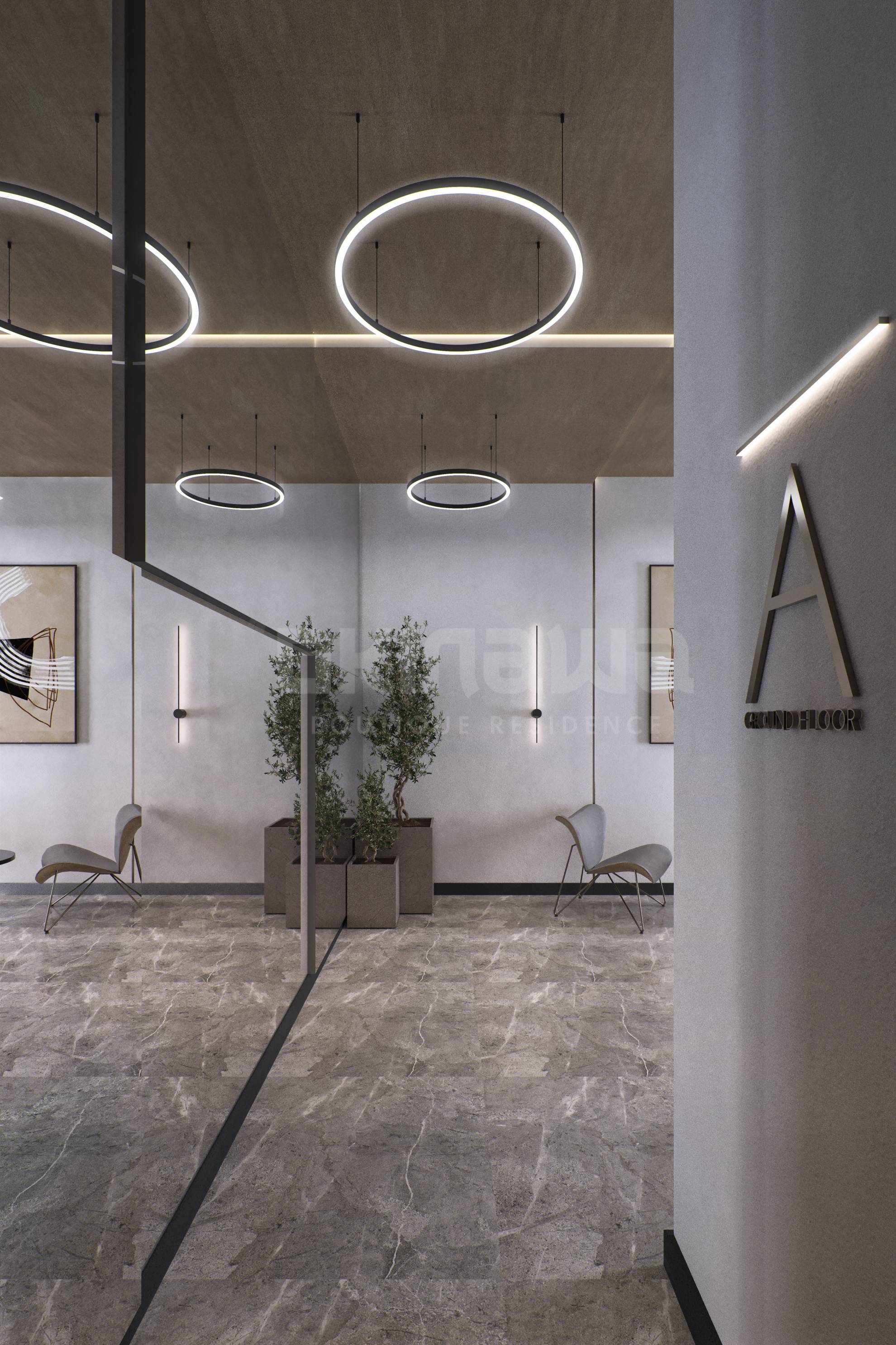 Настилките по общите части на сградата, фоайе, коридори и стълбища ще са изпълнени с плочи от естествен камък — полиран гранит. Стълбищните парапети са ажурни, от алуминий, по архитектурен детайл, видим в интериорните 3D визуализации на сградата. Ще бъдат предвидени стъклени врати към етажните площадки, които са димоуплътнени и самозатварящи се. За настилките на балконите и лоджиите сме избрали италиански гранитогрес, осигурен срещу хлъзгане. Откритите тераси ще са с изграден двоен под и подови настилки от италиански керамични плочи.