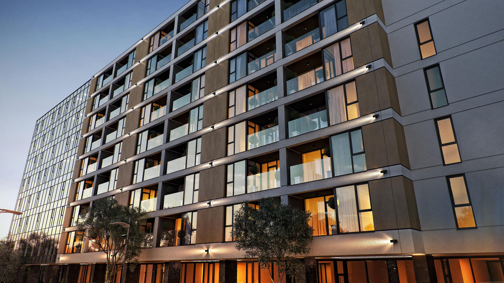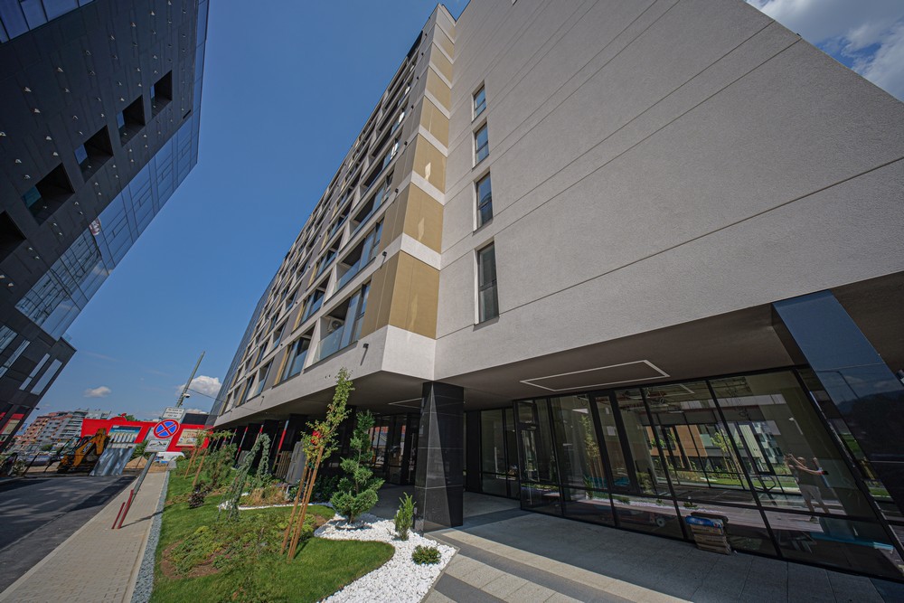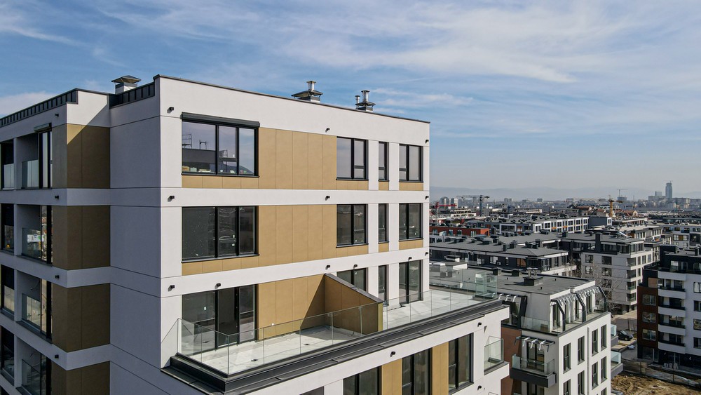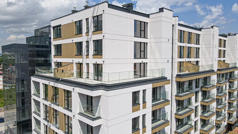 Високотехнологична, дишаща фасада, представляваща комбинация от топлоизолационна система на Baumit с минерална мазилка по архитектурен детайл от експандиран полистирол EPS 10 см и вентилируема, окачена върху алуминиева конструкция, облицована с керамични плочи на водещия италиански производител Laminam, от колекцията Seta, със златист мотив. Плочите Laminam запазват своите спецификации, дори когато са изложени на топлина, UV лъчи и замръзване. Също така са устойчиви на удари, петна и драскотини. В окачения фасаден пакет ще бъде вградена изолация от 10 см каширана каменно-минерална вата, марка ROCKWOOL, с пародифузна и ветрозащитна мембрана, която има плътност 50 кг/м³, минимални топлозагуби — λ = 0,035 W/mK. Вентилируемата фасада осигурява отлична топлоизолация и паропропускливост, задържа влагата извън сградата, намалява топлинните загуби през зимата и проникването на горещ въздух през лятото, повишава хидроизолацията и шумоизолацията, защитата срещу сняг, дъжд и конденз откъм вътрешните страни на стените на сградата.
