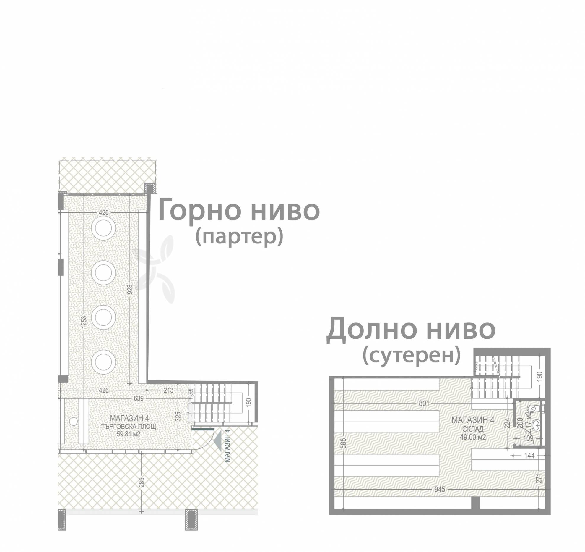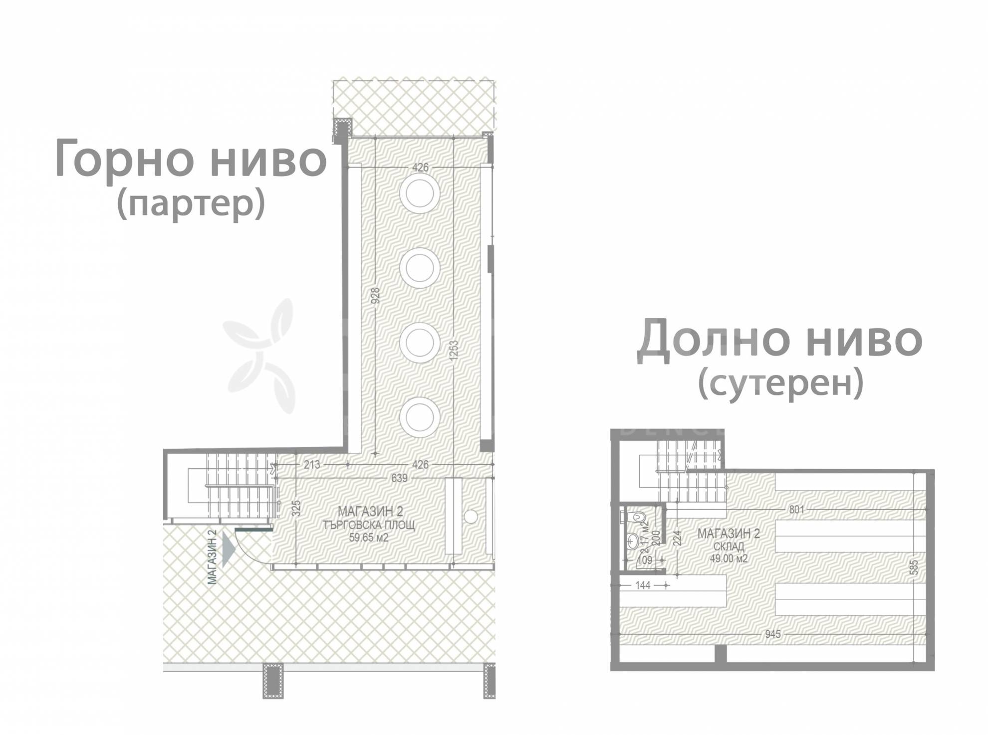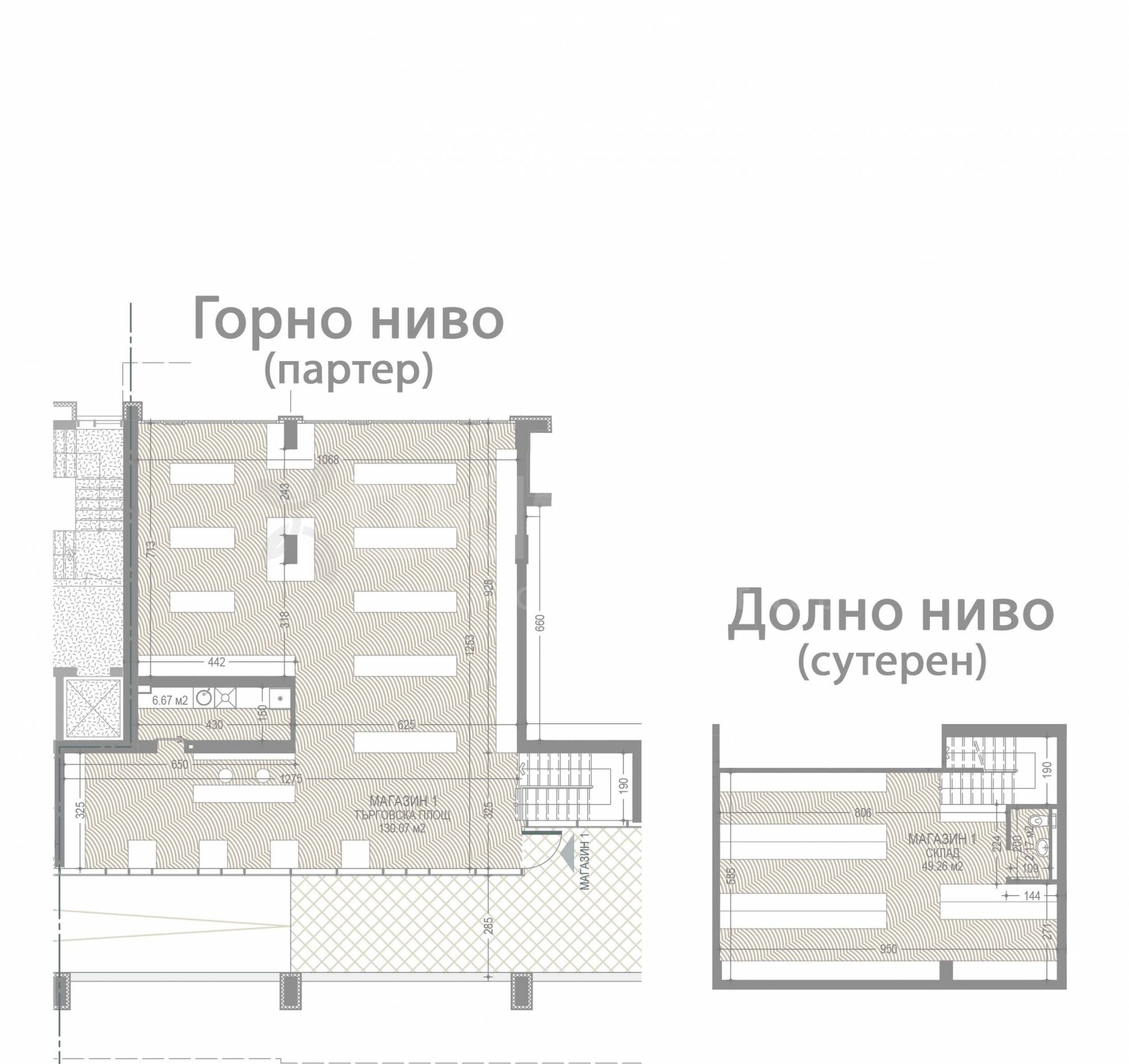 магазини със собствени складове на две нива, разположени на партера и първото подземно ниво, в южната част на сградата;